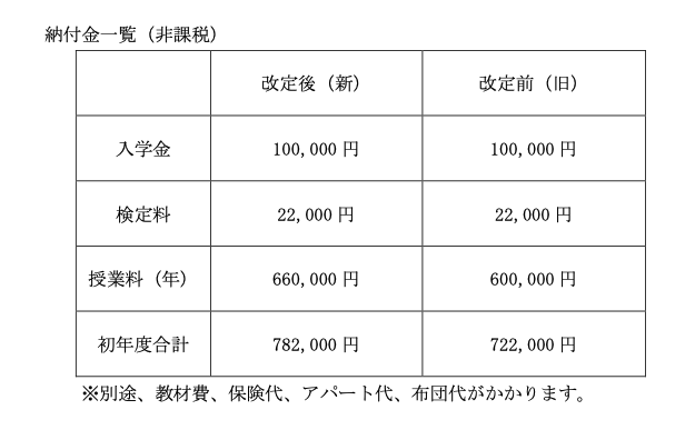 この度、日本国内における昨今の物価上昇の影響を受け、来年度(2025 年 4 月 1 日)から下記のとおり納付金の授業料を改定いたします。